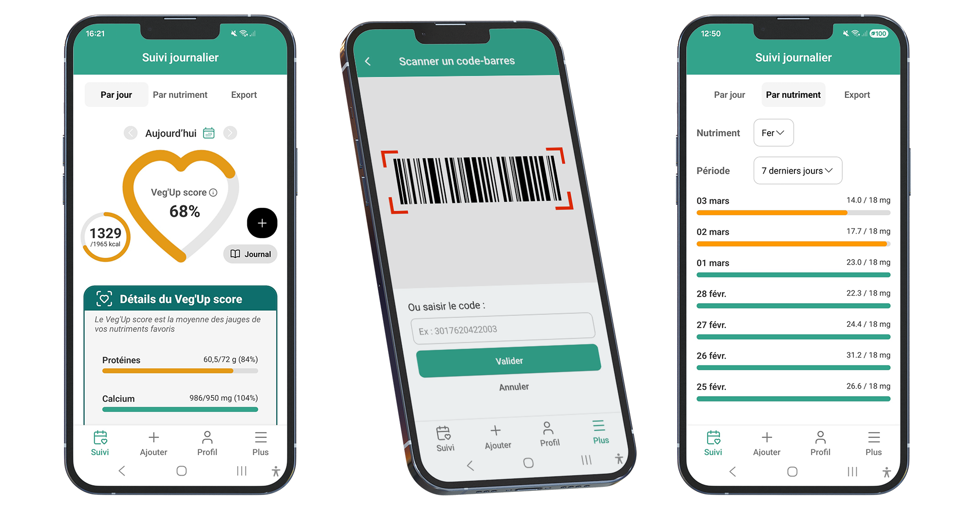 Le fer ? La vitamine D ? Le calcium ? Choisissez quels nutriments vous souhaitez surveiller en priorité. Grâce au Veg’Up score, vous pourrez voir vos apports en un coup d’œil et surveiller facilement vos objectifs journaliers.
